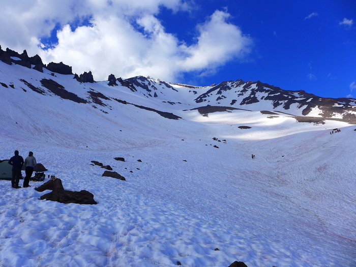 Около 8 вечера мы поставили палатку на предположительном берегу озера Helen Lake. Озеро полностью закрыто снегом, как и все на этой высоте. Вокруг нас много палаток и туристов. Открытой или текущей воды здесь нет. Необходимо топить снег, благо его много и он чистый.